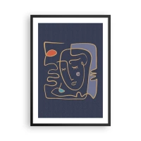 Plakát v černém rámu - Minimalistický abstraktní obličej na tmavě modrém pozadí ve stylu čárové grafiky - 50x70cm - V zádumčivosti - Moderní nástěnná dekorace do obývacího pokoje a ložnice ARTTOR