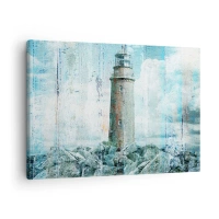 Obraz na plátně - Maják na skalnatém pobřeží v pastelových barvách - 70x50cm - Na starém dřevě - Moderní nástěnná dekorace do obývacího pokoje a ložnice ARTTOR