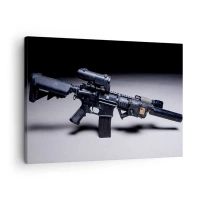 Obraz na plátně - Moderní puška v černé barvě na tmavém pozadí - 70x50cm - Temný rytíř - Moderní nástěnná dekorace do obývacího pokoje a ložnice ARTTOR