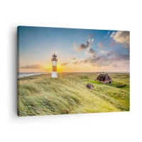 Obraz na plátně - Maják s loukami a domy zalitými sluncem v pozadí - 70x50cm - Mezi vlnami - Moderní nástěnná dekorace do obývacího pokoje a ložnice ARTTOR