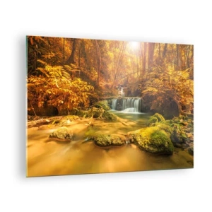 Obraz na skle - Lesní kaskáda ve zlatě - 70x50cm - Lesní vodopád ve zlaté - Moderní nástěnná dekorace do obývacího pokoje a ložnice ARTTOR