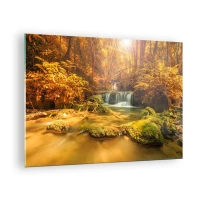 Obraz na skle - Lesní potok s vodopády v podzimní krajině - 70x50cm - Chvatem podzimním lesem - Moderní nástěnná dekorace do obývacího pokoje a ložnice ARTTOR