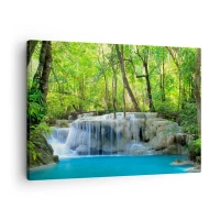 Obraz na plátně - Vodopád mezi zelenými stromy s modrou vodou v přírodním prostředí - 70x50cm - Utonout v tyrkysu a zeleni - Moderní nástěnná dekorace do obývacího pokoje a ložnice ARTTOR