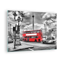 Obraz na skle - Červený autobus proti černobílé městské krajině - 70x50cm - Skutečné krevní řečiště města - Moderní nástěnná dekorace do obývacího pokoje a ložnice ARTTOR