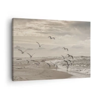 Obraz na plátně - Racek za letu nad přímořskou krajinou - 70x50cm - Šumění moře, zpěv ptáků - Moderní nástěnná dekorace do obývacího pokoje a ložnice ARTTOR