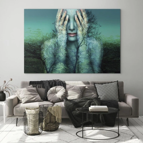 Obraz na skle - Ženská tvář s motivem stromu v surrealistickém prostředí - 70x50cm - Ponořená do modré - Moderní nástěnná dekorace do obývacího pokoje a ložnice ARTTOR