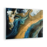Obraz na skle - Abstraktní kompozice v odstínech modré a zlaté - 70x50cm - Modrá – žlutá – vzájemné vlivy - Moderní nástěnná dekorace do obývacího pokoje a ložnice ARTTOR