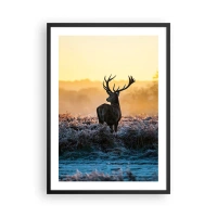 Plakát v černém rámu - Jelen na mrazivé mýtině při východu slunce - 50x70cm - Korunován na svém panství - Moderní nástěnná dekorace do obývacího pokoje a ložnice ARTTOR