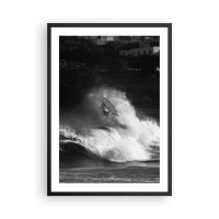 Plakát v černém rámu - Černobílý surfař v akci na rozbouřených vlnách - 50x70cm - Výzva přijata! - Moderní nástěnná dekorace do obývacího pokoje a ložnice ARTTOR