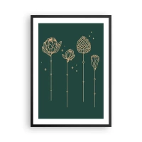 Plakát v černém rámu - Zlaté obrysy květin na tmavě zeleném pozadí - 50x70cm - Bylinky - Moderní nástěnná dekorace do obývacího pokoje a ložnice ARTTOR