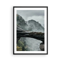 Plakát v černém rámu - Fotografie tajemného skalního mostu zahaleného mlhou v horské krajině. - 50x70cm - Dobrodružství právě začíná - Moderní nástěnná dekorace do obývacího pokoje a ložnice ARTTOR