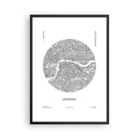 Plakát v černém rámu - Minimalistická černobílá mapa Londýna - 50x70cm - Anatomie Londýna - Moderní nástěnná dekorace do obývacího pokoje a ložnice ARTTOR
