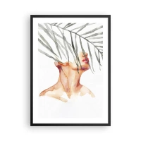 Plakát v černém rámu - Akvarelová žena s palmovými listy zakrývajícími si obličej - 50x70cm - Vnímat tep tropů - Moderní nástěnná dekorace do obývacího pokoje a ložnice ARTTOR
