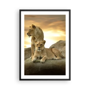 Plakát v černém rámu - Dvě lvice proti zapadajícímu slunci - 50x70cm - Královský majestát - Moderní nástěnná dekorace do obývacího pokoje a ložnice ARTTOR
