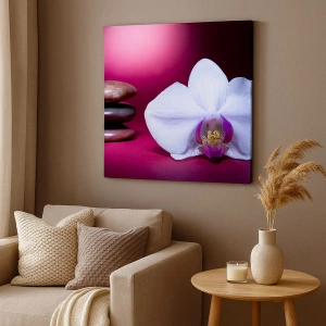 Nástěnné umění - Studie svěžesti ve fialové - Bílá orchidej a kameny na růžovém pozadí