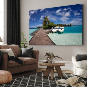 - Malebný výhled na dřevěné molo vedoucí k tyrkysovému moři s palmami a loděmi v pozadí. Perfektní doplněk do interiérů inspirovaných tropickým stylem.