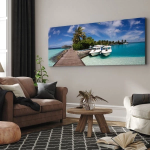 Obraz na plátně - Molo nad tyrkysovým mořem s loděmi a palmami - 70x50cm - A přece ráj existuje - Moderní nástěnná dekorace do obývacího pokoje a ložnice ARTTOR