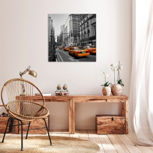 - Dynamický pohled na žluté taxíky v ulicích New Yorku. Dokonalá dekorace pro milovníky městského stylu a energie metropole. Hodí se do moderních i industriálních interiérů.