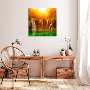 Motiv vodopádů a okolní zeleně symbolizuje harmonii, obnovu a kontakt s přírodou. Zlatavé světlo zapadajícího slunce dodává obrazu teplo, klid a jemnou eleganci, což dokonale splňuje potřeby těch, kteří oceňují stylové a inspirativní dekorace.