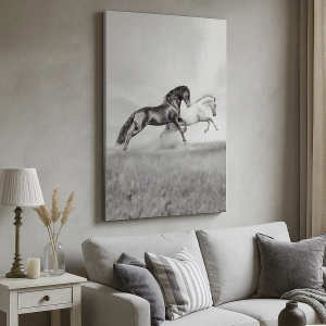 - Tento obraz zobrazuje dva cválající koně v dynamické černobílé kompozici. Je to perfektní dekorace pro milovníky zvířat a ty, kteří mají rádi elegantní styl.