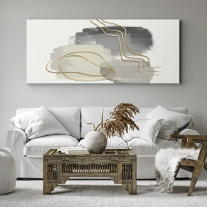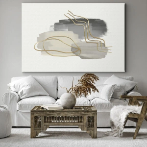 Plátno „Abstraktní zlaté linky na šedém pozadí“ je vyjádřením moderního umění a elegance. Jeho hlavním motivem jsou jemné zlaté linky, které harmonicky doplňují šedé pozadí v různých odstínech. Celé dílo zaujme svou minimalistickou formou a uměleckým vyjádřením, což z něj činí perfektní dekoraci pro moderní interiéry.