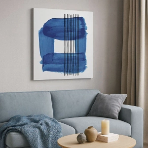 Ústředním prvkem obrazu jsou široké tahy modré barvy, které vytvářejí harmonický základ, a svislé černé linky vnášejí rytmus a modernitu. Jemné tónové přechody dodávají tomuto obrazu hloubku a eleganci, díky čemuž je perfektním doplňkem minimalistických a moderních interiérů.