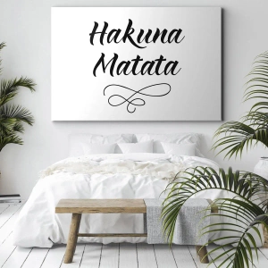 - Tento plátěný tisk zdobí inspirativní citát „Hakuna Matata“ v elegantním písmu na bílém pozadí. Jeho minimalistický styl a univerzální přitažlivost dokonale doplní moderní i klasické interiéry.