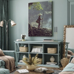 - Tento plátěný obraz o rozměrech 70x50 cm zobrazuje postavu s kopím u vodopádu v tropickém lese. Exotický motiv s jemnými barvami, ideální do interiérů inspirovaných přírodou.