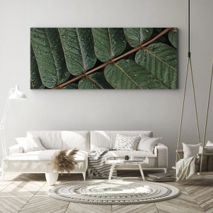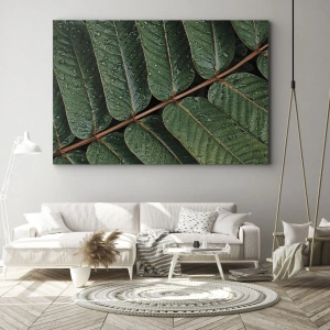 - Tento obraz na plátně zobrazuje makrozáběr zelených listů s kapkami rosy. Je ideální do interiérů inspirovaných přírodou a přináší harmonii a svěžest.