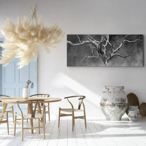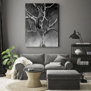 - Tento černobílý obraz na plátně zobrazuje suchý strom na pozadí mlhy. Ideální pro interiéry, které si cení harmonie a minimalismu.