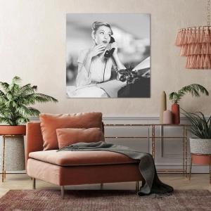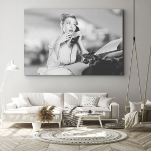 - Tento černobílý obraz zobrazuje ženu, jak telefonuje a sedí u psacího stroje. Jeho vintage styl zachycuje atmosféru minulých časů a je ideální pro výzdobu kanceláře nebo stylového interiéru.