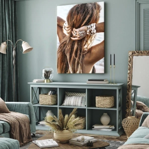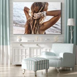 - Obraz zobrazuje ženu na pláži za slunečného letního dne. Její rozpuštěné vlasy, ozdobené náramky z mušlí, dodávají obrazu bohémský nádech. Díky přírodním barvám a letní atmosféře se tento obraz dokonale hodí do světlých interiérů.