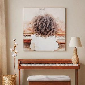 - Obraz zobrazuje dívku s bujnými, kudrnatými vlasy sedící u klavíru. Kompozice se vyznačuje jemnými pastelovými odstíny, které vytvářejí atmosféru tepla a klidu. Je to perfektní doplněk do klasického i moderního interiéru.