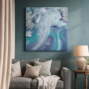 - Obraz zobrazuje abstraktní víry v odstínech modré a bílé, které vytvářejí harmonickou a jemnou kompozici. Ideální pro moderní interiéry, které si cení klidu a elegance.