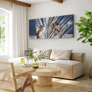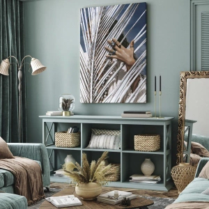 Palmové listy v kombinaci s intenzivním modrým pozadím dodávají celku tropický charakter. Prsteny na rukou ženy zdůrazňují její individualitu a originální styl, vnášejí do obrazu sofistikovanost a nádech bohémské estetiky. Toto umělecké dílo se perfektně hodí do interiérů překypujících inspirací a hledajících neobvyklé dekorace.