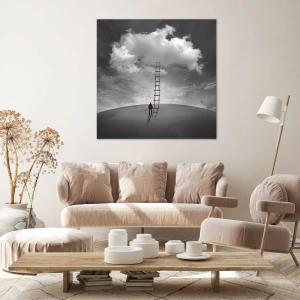 Obraz na plátně - Osoba v červeném kabátě a žebřík vedoucí k oblaku - 70x50cm - Všechno je možné - Moderní nástěnná dekorace do obývacího pokoje a ložnice ARTTOR