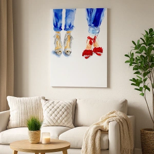 - Umělecká ilustrace dvou párů bot, zobrazující stylové sandály v kombinaci s džínami. Dokonalá dekorace pro módní a kreativní interiéry, která dodává umělecký a moderní nádech. Tisk má rozměr 70x50 cm.