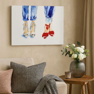 Nástěnný obraz - Možná se půjdeme projít? - Ilustrace dvou párů bot ve stylových sandálech a džínách