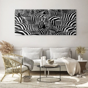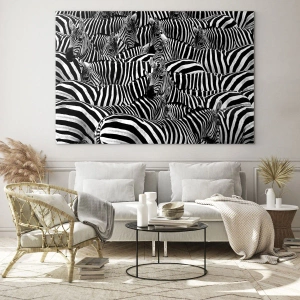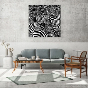 Obraz na skle - Stádo zeber v černobílém provedení - 70x50cm - Skupinový portrét s pruhy - Moderní nástěnná dekorace do obývacího pokoje a ložnice ARTTOR
