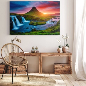 Obraz na plátně - Malebný vodopád a hora při západu slunce - 70x50cm - Island - oheň a voda - Moderní nástěnná dekorace do obývacího pokoje a ložnice ARTTOR