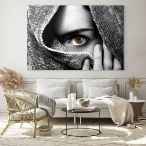 Obraz na skle - Jedno oko skryté za monochromatickou texturou látky - 70x50cm - Poznej tajemství - Moderní nástěnná dekorace do obývacího pokoje a ložnice ARTTOR