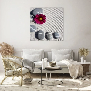 - Kameny s bílými pruhy uspořádané na písku v zenovém stylu, ozdobené fialovým květem. Tento skleněný obraz o rozměrech 70x50 cm je ideální do interiérů, které vytvářejí atmosféru klidu a harmonie.
