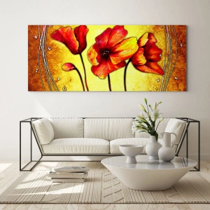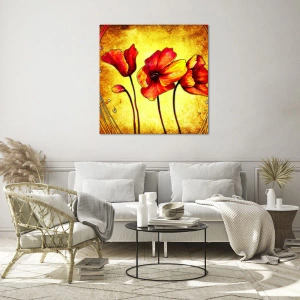 Obraz na skle - Červené vlčí máky na pozadí zlatých odstínů s uměleckými detaily - 70x50cm - V secesní dekoraci - Moderní nástěnná dekorace do obývacího pokoje a ložnice ARTTOR