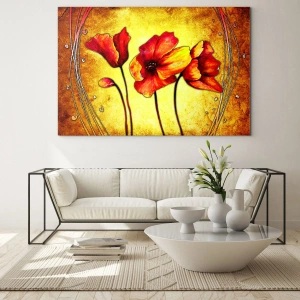 Vlčí mák, jako symbol krásy, jemnosti a přírody, je hlavním motivem obrazu a přitahuje pozornost svou intenzivní červenou barvou. Zlaté odstíny pozadí dodávají teplo a eleganci a zároveň zdůrazňují umělecký charakter celé kompozice. Dekorativní linie a detaily v pozadí dodávají obrazu jedinečnou atmosféru a dynamiku.