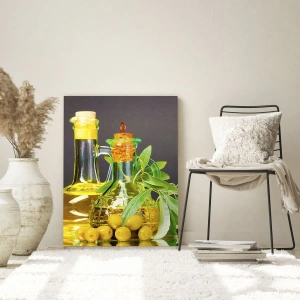 Obraz na skle - Zátiší s olivami a olejem - 50x70 cm
