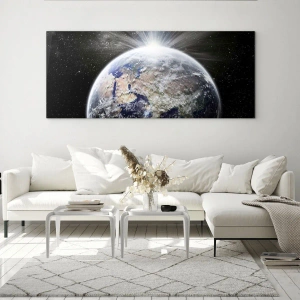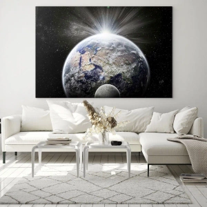 - Obraz zobrazuje Zemi a Měsíc na kosmickém pozadí s paprskem světla. Je to perfektní dekorace pro nadšence do astronomie a vesmíru.