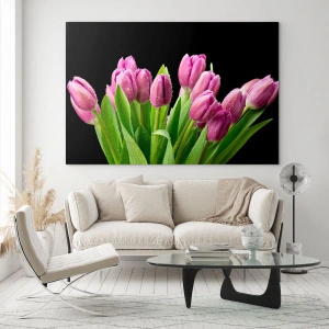 Obraz na skle - Kytice růžových tulipánů pokrytá kapkami vody na černém pozadí. - 70x50cm - Liliové potěšení jara - Moderní nástěnná dekorace do obývacího pokoje a ložnice ARTTOR
