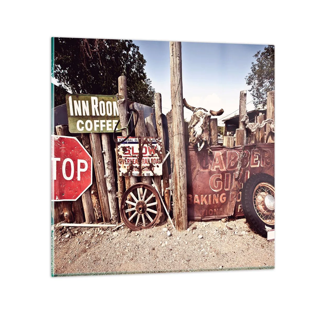 Obraz na skle je vyrobený ze skla o tloušťce 4 mm. Hrany skla mají matný lichoběžníkový výbrus. Obraz bezpečný na používání a připravený k zavěšení – má kovové závěsy upevněné na zadní straně obrazu a pěnové distanční podložky regulující rovnoměrnou vzdálenost obrazu od stěny.