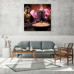 Nástěnné umění - Vyčistěte si mysl, uklidněte své tělo - Relaxační kompozice s Buddhou, svíčkami a květinami