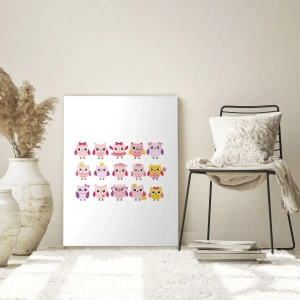 - Obraz zobrazuje sbírku barevných sov v různých vzorech, které na bílém pozadí vytvářejí veselý motiv, ideální do dětského interiéru.